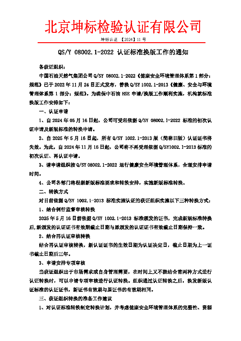 - QS/Y 08002. 1-2022認(rèn)證標(biāo)準(zhǔn)換版工作的通知 坤標(biāo)認(rèn)證[2024] 11號